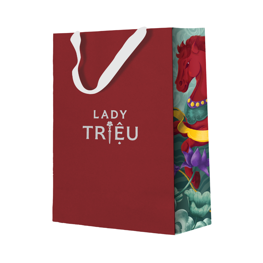 Lady Triệu Contemporary Hộp Quà Tết 2026 sở hữu thiết kế hiện đại pha nét truyền thống Á Đông. Thân chai thủy tinh trong suốt ánh xanh ngọc, khắc họa hình ảnh Nữ tướng Triệu biểu tượng của sức mạnh và tự do.