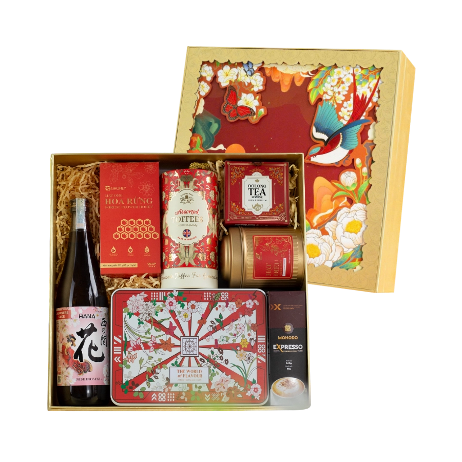 Khác với những hộp quà mang phong cách châu Âu thường thấy thì Set Quà Tết Nghênh Sắc 10 lại thổi một làn gió Á Đông rất riêng. Đây là sự lựa chọn mới lạ dành cho những ai yêu thích văn hóa Nhật Bản hoặc muốn tìm kiếm hương vị nhẹ nhàng. Sản phẩm được đóng gói chỉn chu và đẹp mắt hứa hẹn sẽ là điểm nhấn thú vị trên bàn tiệc ngày xuân.