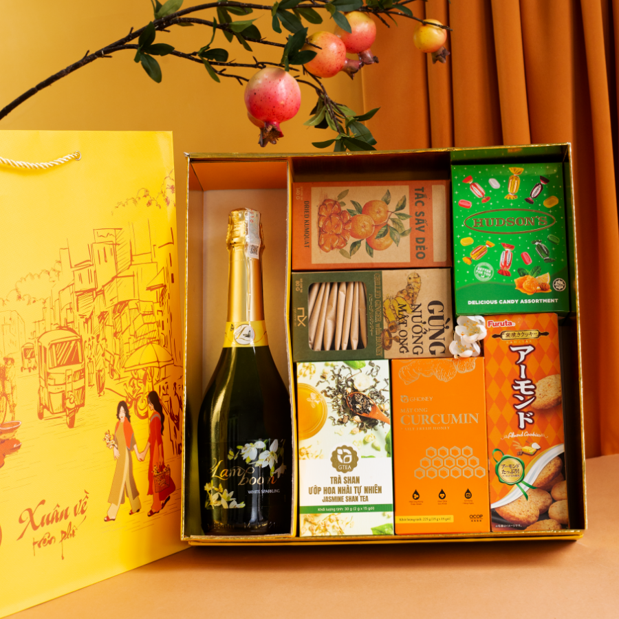 Set Quà Tết Phố Xuân 1 đại diện cho sự sống động, niềm vui và tinh thần hân hoan của mùa xuân về trên mọi nẻo đường phố thị. Màu vàng rực rỡ và tiếng bọt vang sủi nổ lách tách tượng trưng cho sự bùng nổ của tài lộc và may mắn trong năm mới. Đây là món quà thể hiện sự chu đáo đối với cả sức khỏe lẫn tinh thần.