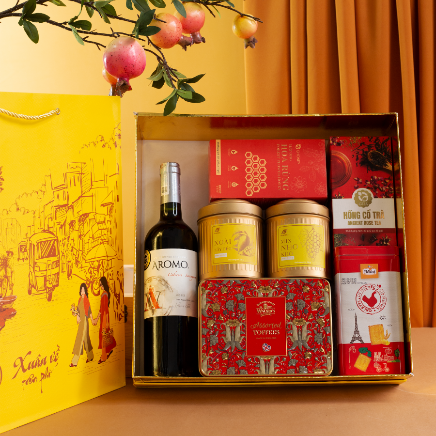 Bên trong lớp vỏ hộp đầy hoài niệm là sự giao thoa thú vị giữa văn hóa ẩm thực Đông Tây. Bạn sẽ tìm thấy sự kết hợp hài hòa giữa rượu vang Chile hiện đại và bánh kẹo châu Âu cổ điển cùng nông sản Việt Nam mộc mạc. Set Phố Xuân 2 gói ghém trọn vẹn hương vị của một cái tết đoàn viên, sung túc và đậm đà bản sắc dân tộc.