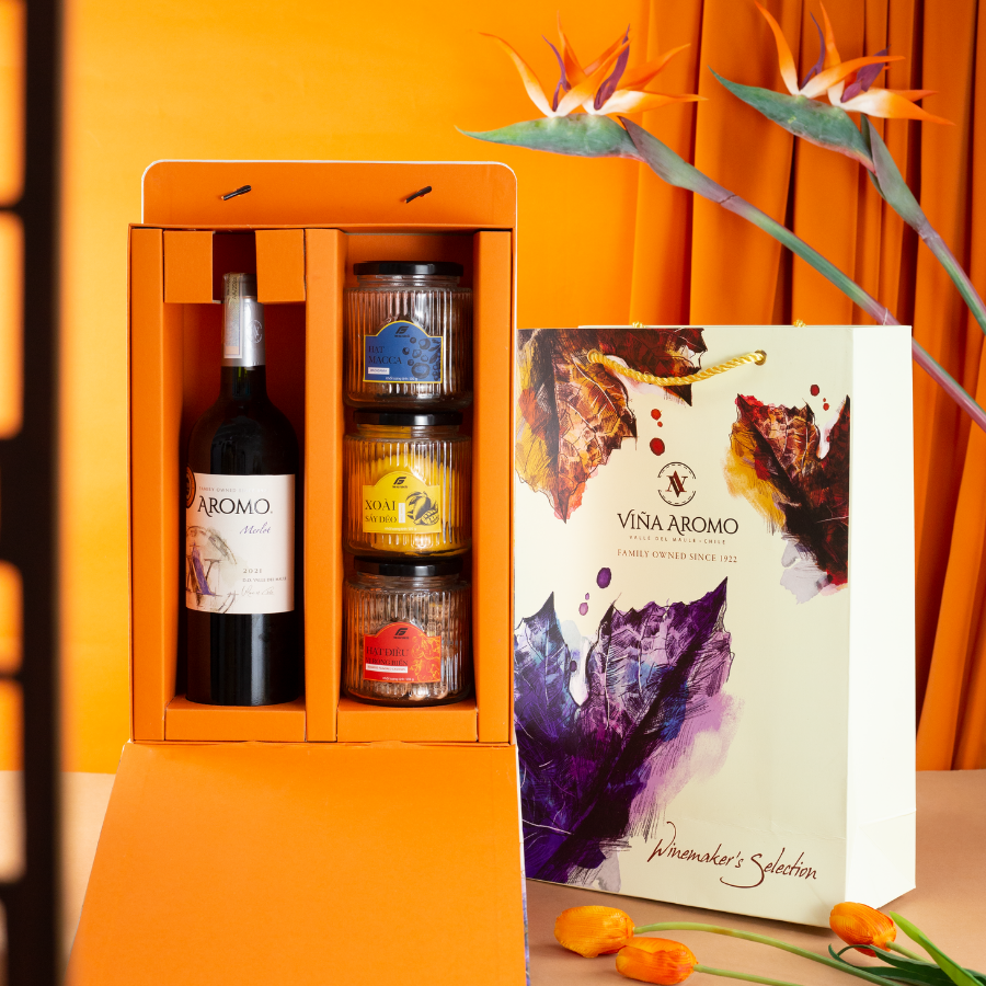 Linh hồn của set quà là chai vang đỏ Aromo Merlot đến từ thung lũng Maule Chile nổi tiếng. Khác với dòng Cabernet mạnh mẽ thì Merlot lại được ví như một quý cô mềm mại. Rượu có màu đỏ ruby tươi tắn và vị chát rất thấp nên cực kỳ dễ uống. Bạn sẽ cảm nhận rõ hương thơm của mận chín và anh đào lan tỏa nhẹ nhàng. Đây là chai vang hoàn hảo cho những bữa tiệc nhẹ.