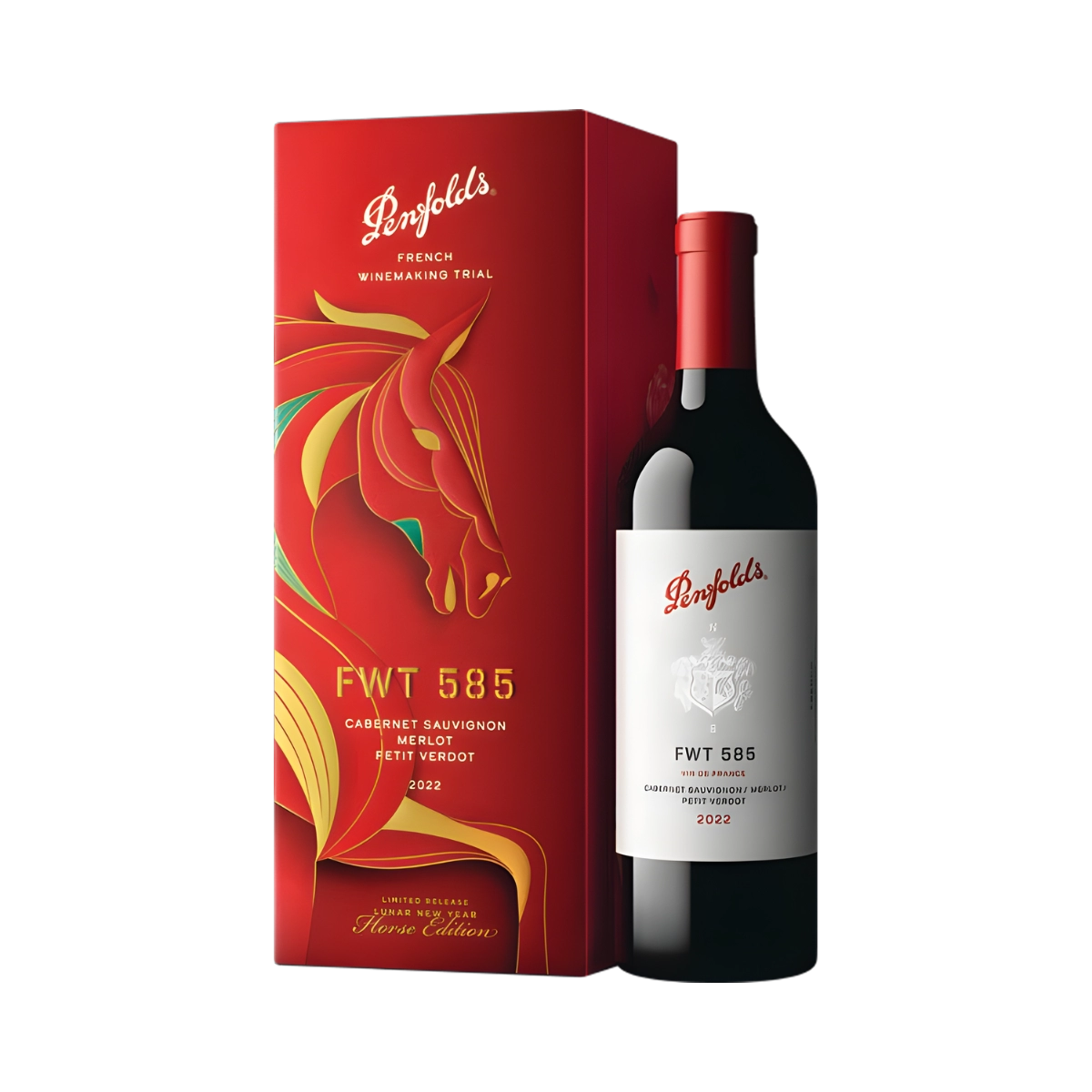 FWT là viết tắt của French Winemaking Trial, dự án thử nghiệm làm rượu vang tại Pháp. Con số "585" là số hiệu khoang chứa mà Penfolds dùng để phân loại dòng vang pha trộn Bordeaux này, giữ sự nhất quán trong hệ thống đánh số của hãng. Phiên bản này được thiết kế riêng cho Tết Nguyên Đán 2026 với chủ đề Năm Giáp Ngọ. Hộp quà mang họa tiết Ngựa phi nước đại, sắc đỏ và vàng kim rực rỡ, tượng trưng cho tốc độ, thành công và lời chúc Mã Đáo Thành Công ý nghĩa.