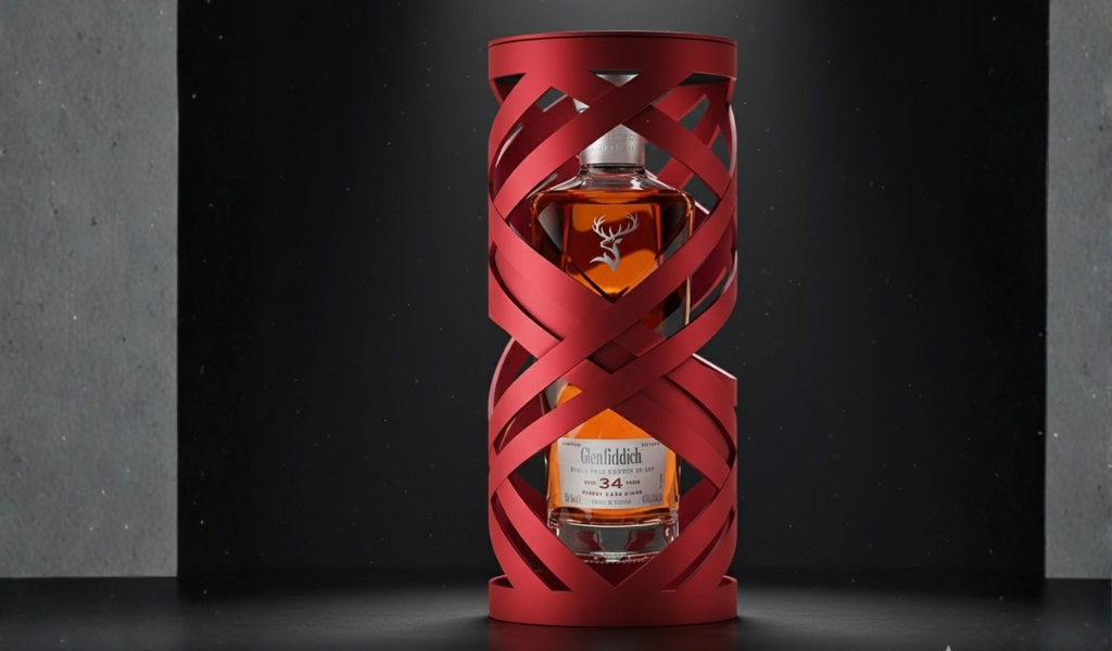 Phiên bản này được thiết kế đặc biệt với hộp đỏ cách điệu hiện đại, thể hiện phong cách sang trọng và tinh giản. Bên trong là chai thủy tinh trong suốt, làm nổi bật màu rượu vàng sậm tự nhiên. Thiết kế bao bì giúp chai Glenfiddich 34 YO không chỉ phù hợp để thưởng thức mà còn là món quà ý nghĩa cho các dịp đặc biệt hoặc để trưng bày trong bộ sưu tập cá nhân.