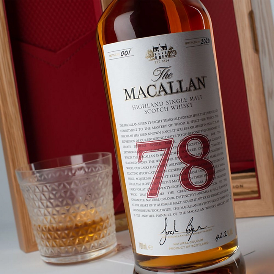 Macallan 78 Year Old: đỉnh cao của chiều sâu với vị socola đen, cam khô và than gỗ cổ điển.